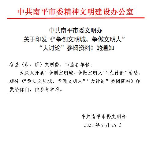 關(guān)于轉(zhuǎn)發(fā)《中共南平市委文明辦關(guān)于印發(fā)<“爭創(chuàng)文明城、爭做文明人” “大討論”參閱資料的通知>的通知》